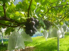 本当はニューピオーネという名前なのですが、ピオーネだけで通っています。大粒で、糖度が高い種無しブドウです。色は黒に限りなく近い紫色で、「でぃいぷぱぁぷる」という名前はピオーネの色に由来しています。